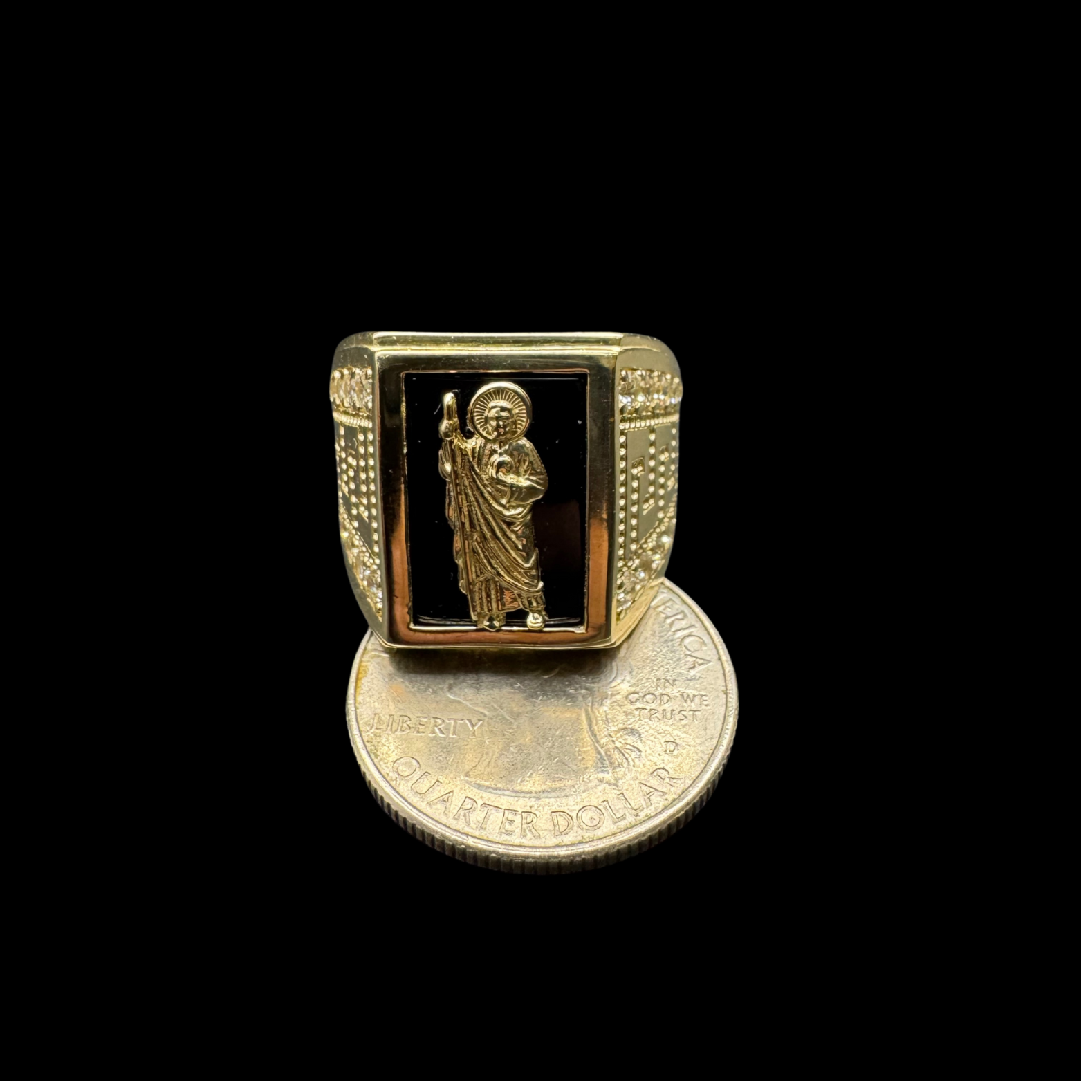 14K SAN JUDAS BLACK STONE WITH ZIRCONS RING